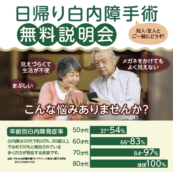 ぜひ、この機会に「日帰り白内障手術の無料説明会」にご参加ください。ご家族の方の参加もお待ちしております。